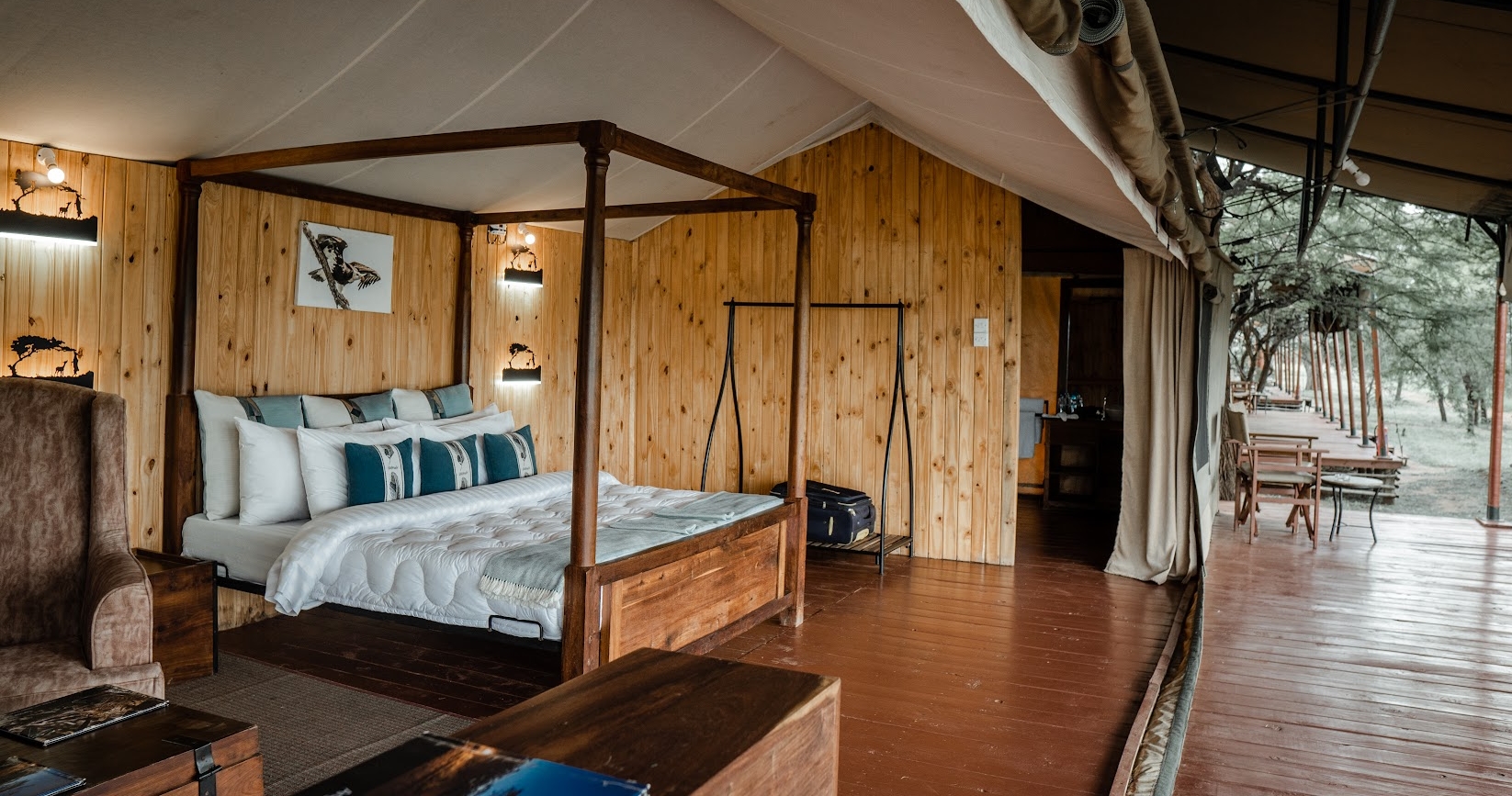 Campen består av smakfullt inredda tält som skapar en härlig safarikänsla. De rymliga tälten har sköna sängar, toalett, dusch och en stor veranda med utsikt över savannen.