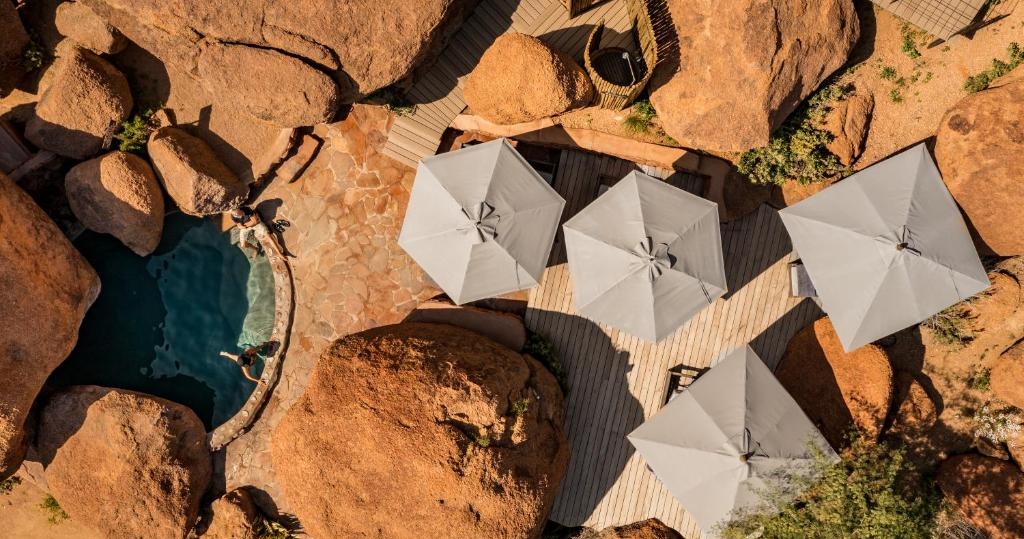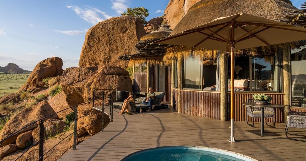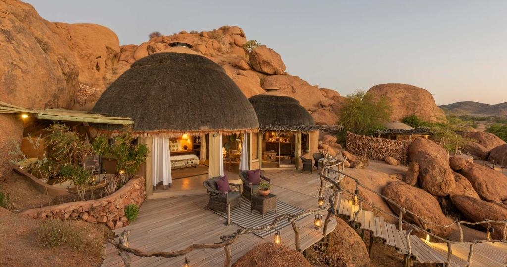Camp Kipwe ligger inbäddat i klipporna i Aba Huab-dalen och erbjuder en naturnära upplevelse med enastående utsikt. Boendet är designat för att smälta in i omgivningen, med faciliteter som inkluderar en pool, skuren ur klipporna och bungalower som ger en känsla av både rymd och privatliv.