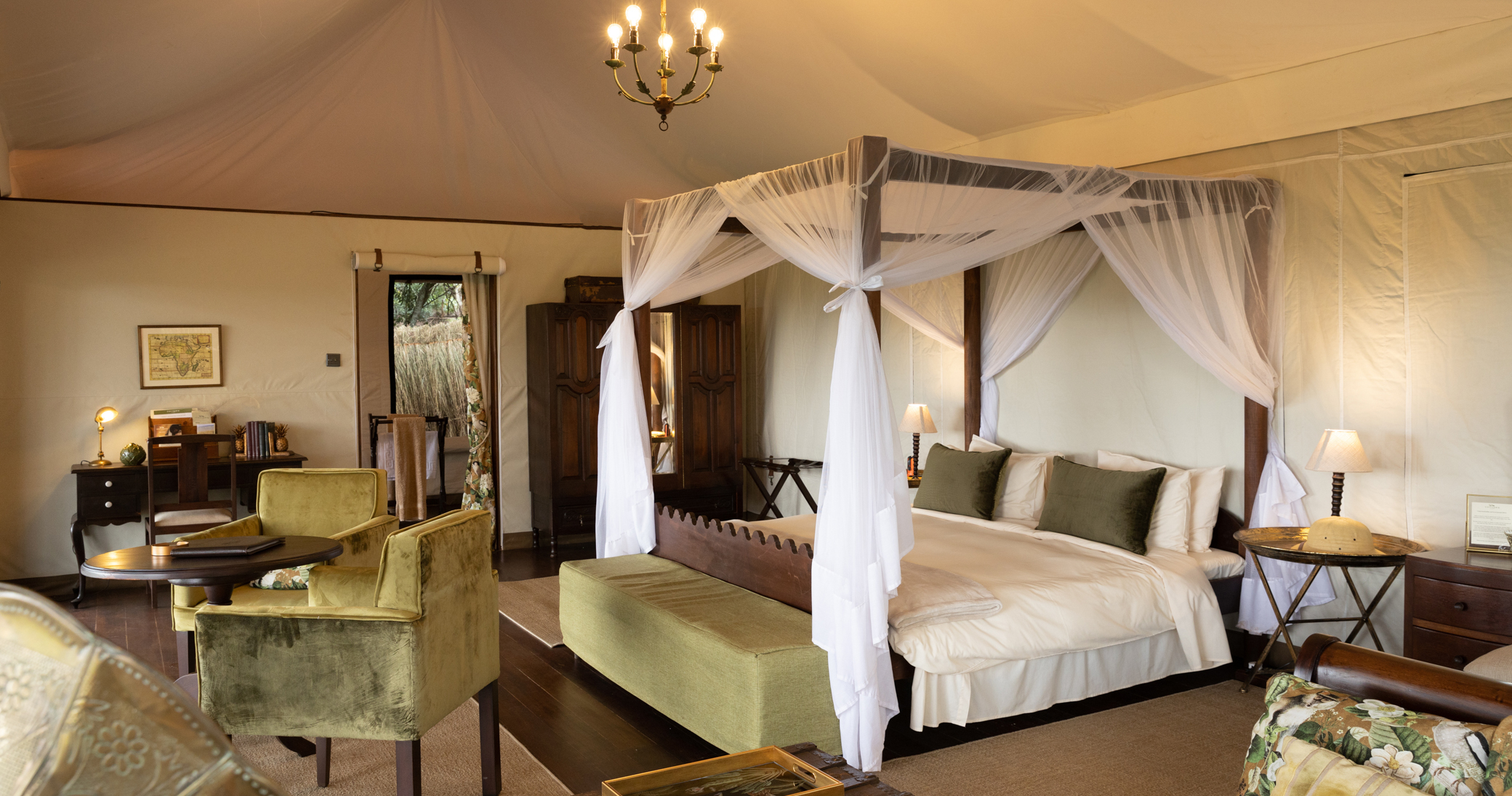 Den autentiska inredningen speglar 1920-talets safariäventyr och kompletteras med modern komfort, inklusive en infinitypool med utsikt över floden. Med endast 16 tält, inklusive ett större familjetält, erbjuder campen en exklusiv och privat upplevelse och välkomnar gäster i alla åldrar.