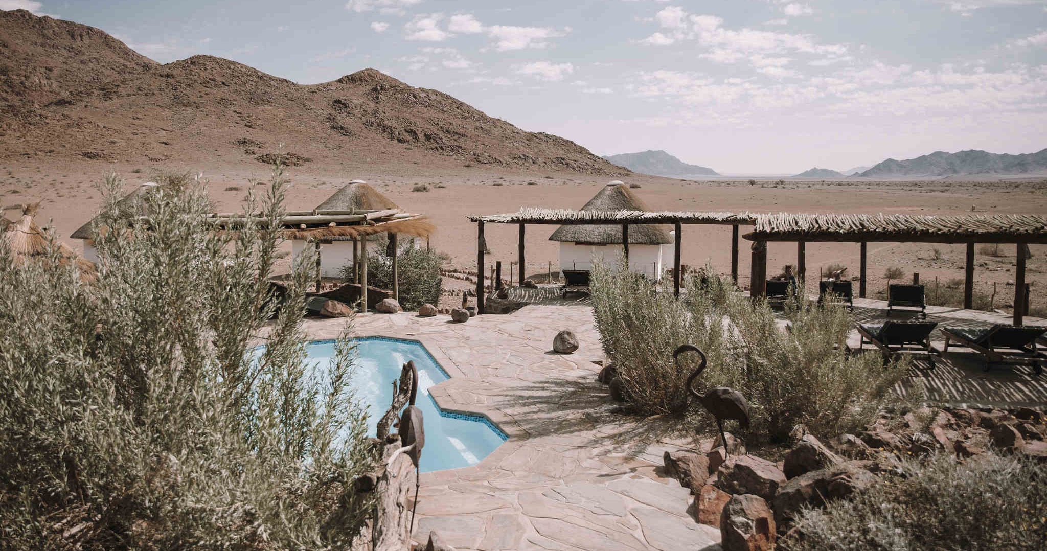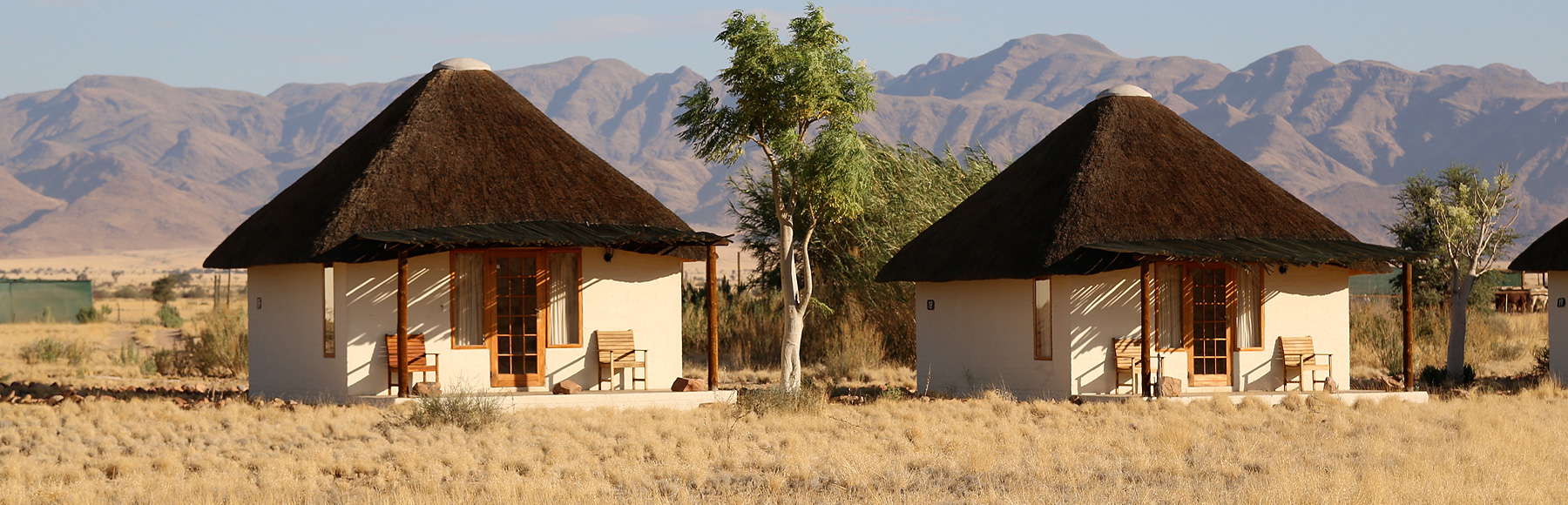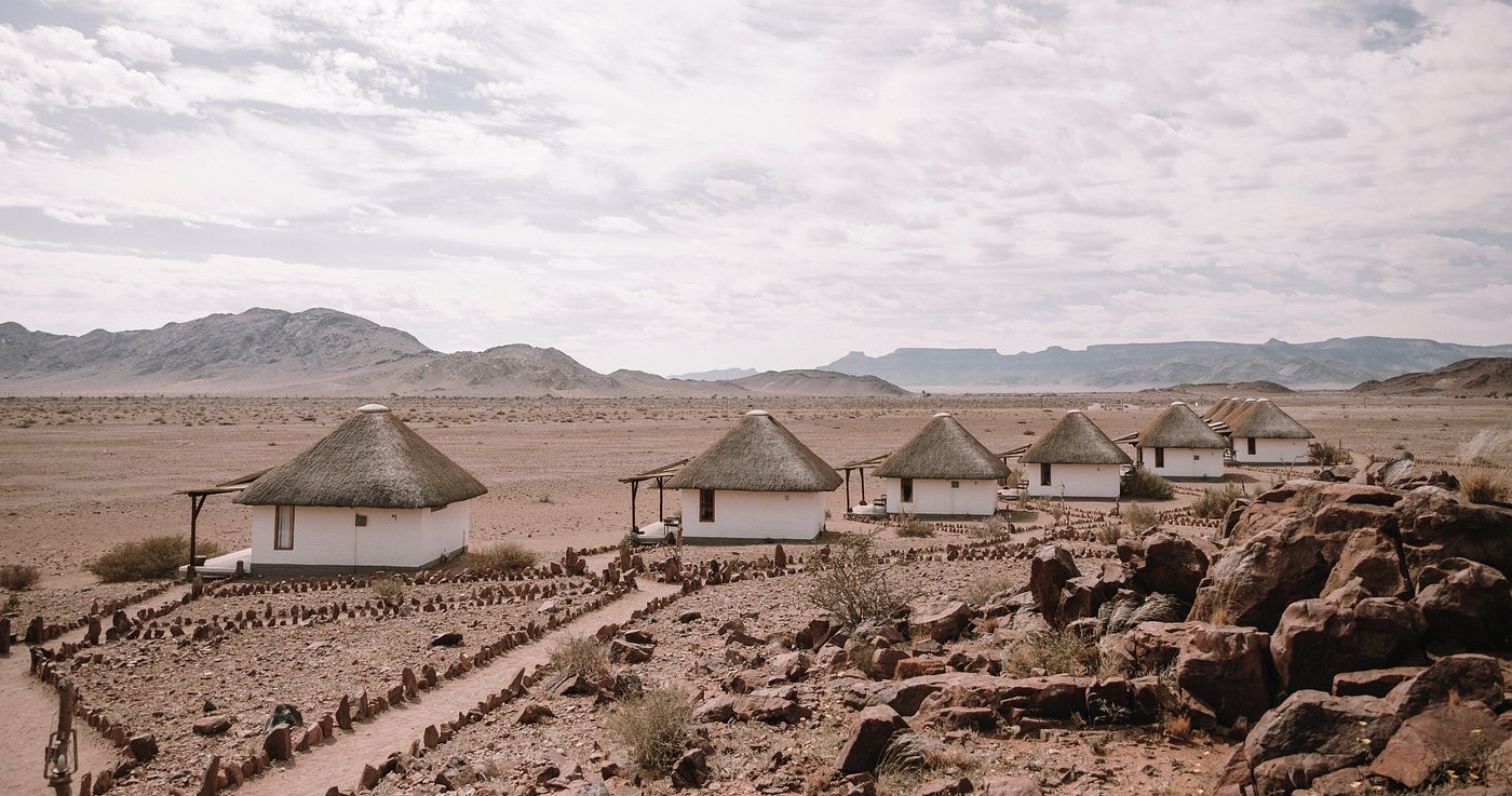 Desert Homestead Lodge är en charmig tillflyktsort belägen i en vidsträckt gräsklädd dal, omgiven av Nubib-, Tsaris- och Naukluftbergen. Lodgen erbjuder stilfullt inredda chaleter med halmtak, vilket skapar en avslappnad atmosfär som smälter in i den omgivande ökenmiljön.