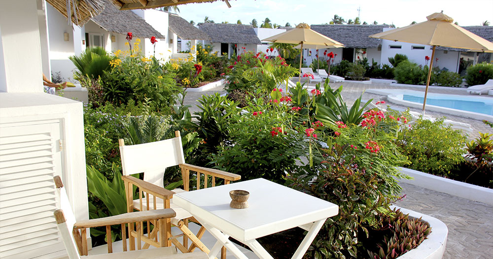 Här bor du i en mysig stuga i en tropisk trädgård med pool. Stugan har ett litet kök med kylskåp och spisplattor, luftkonditionering och egen veranda. Du har tillgång till grannhotellet Mwezis restaurang och strandområde.