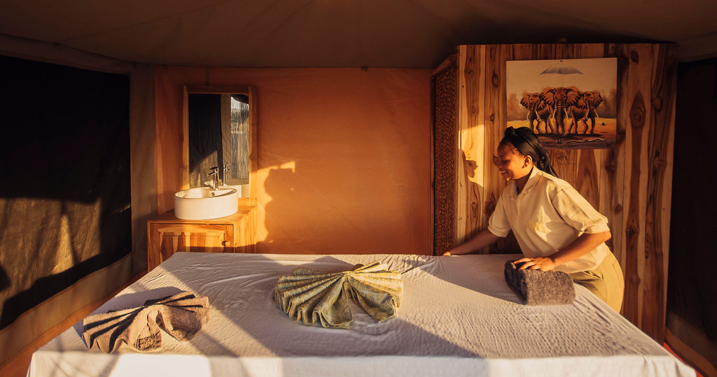 Campen består av ett fåtal rymliga, klassiska safaritält med riktiga sängar, eget badrum och utomhusdusch. Här bor du mitt i vildmarken, men med oväntad komfort. Du vaknar till naturens egna ljud och somnar under en glittrande stjärnhimmel – en autentisk och oförglömlig safariupplevelse, precis som den ska vara.