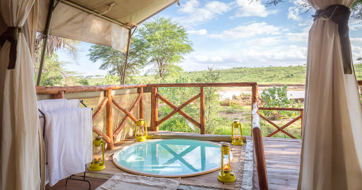 Tälten är moderna och har både toalett och dusch. Från terrassen svalkas du av ljummen flodbris och njuter av Samburus vackra natur.