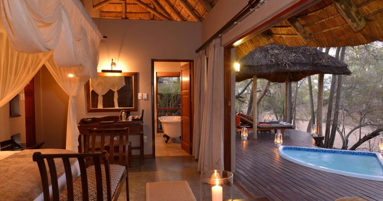 Varje svit har modern afrikansk design, fullt utrustat badrum, privat terrass med uppvärmd spa-bad och utsikt över flodbädden. Mellan safariturerna finns det möjlighet att koppla av vid poolen eller ge sig ut på promenader i omgivningen. Det här är ett perfekt boende för dig som söker en exklusiv och avskild safariupplevelse.