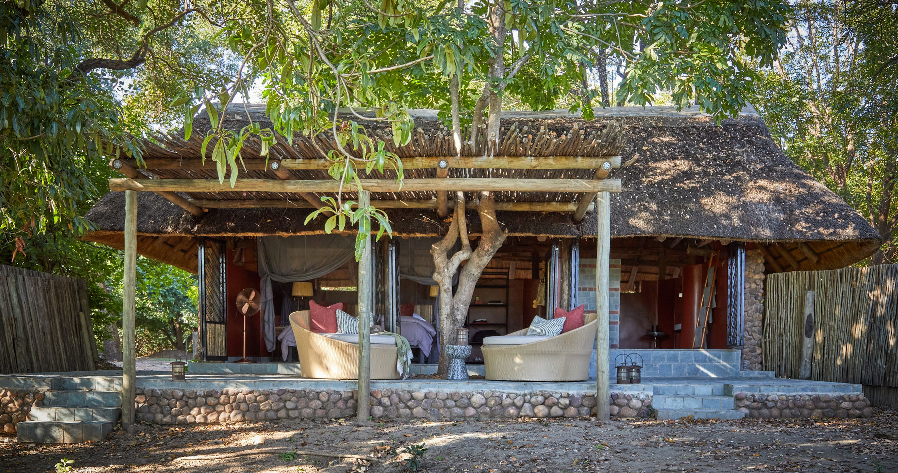 Varje stuga är utrustad med badrum och är utformade för att smälta in i omgivningen, vilket bidrar till den autentiska bush-upplevelsen som det är att bo på Luwi.