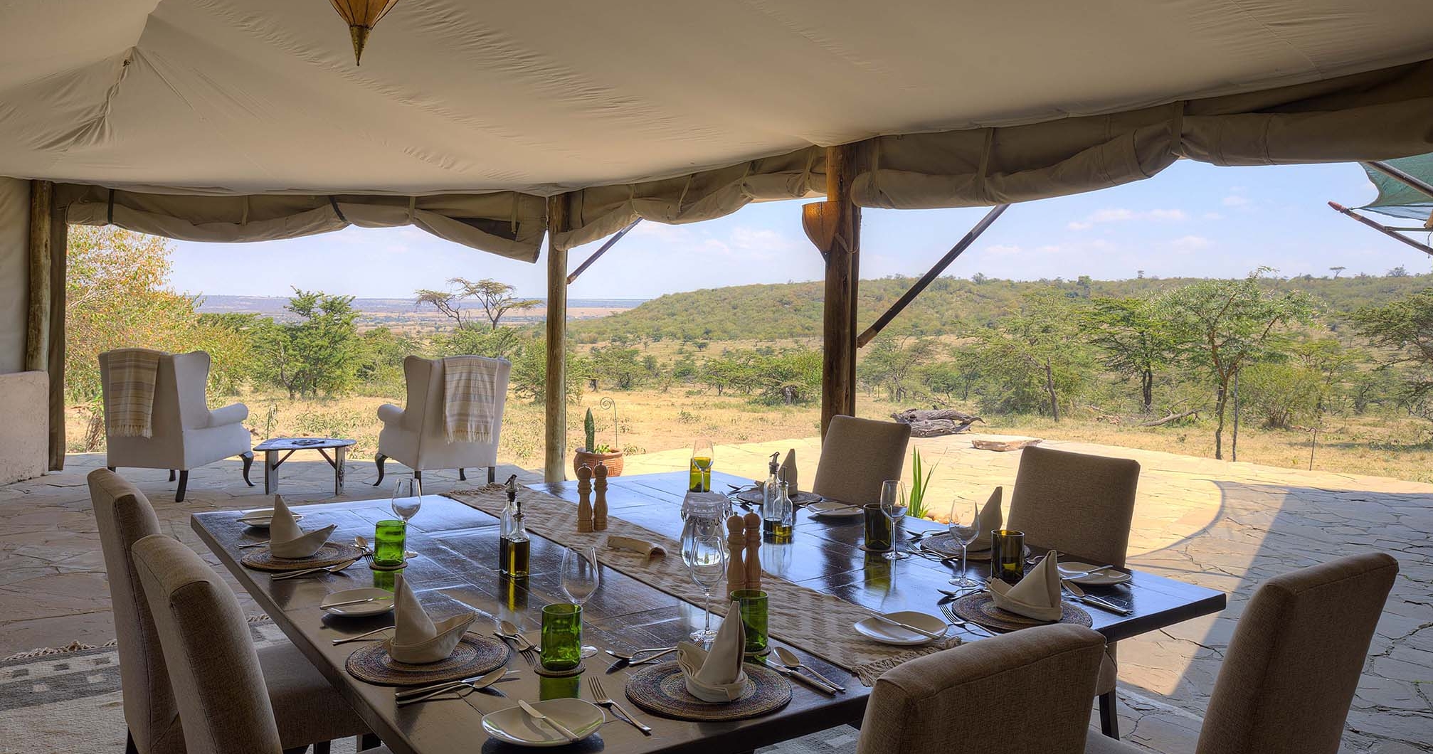 Campen består av nio tält, varav ett familjetält. Tälten är rymliga och här erbjuds privatliv på terrassen utanför där du kan sitta och höra djurlivet och se den mäktiga stjärnhimlen över Masai Mara.