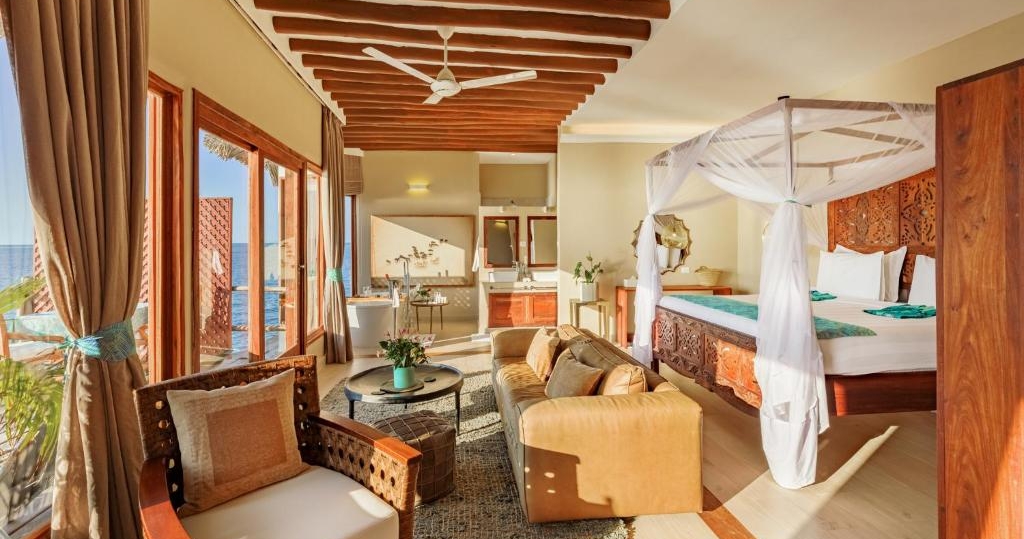 Perfekt för kite-surfing, snorkling, dykning eller bara avkoppling på stranden.: Resorten är designad med hållbarhet i fokus och drivs delvis av solenergi.Det är en idealisk plats för par, familjer eller bröllopsresor som söker en exklusiv och rofylld upplevelse på Zanzibar.