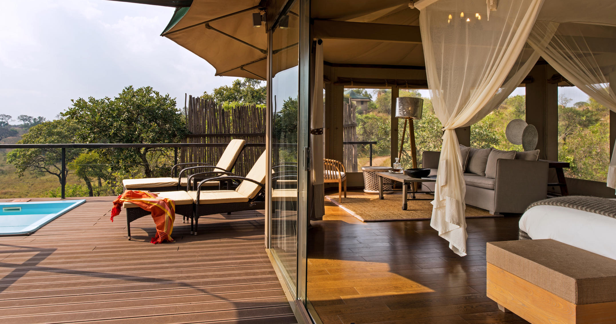 Campen består av smakfullt inredda tält som skapar en härlig safarikänsla. De rymliga tälten har sköna sängar, toalett, dusch och en stor veranda med utsikt över savannen.