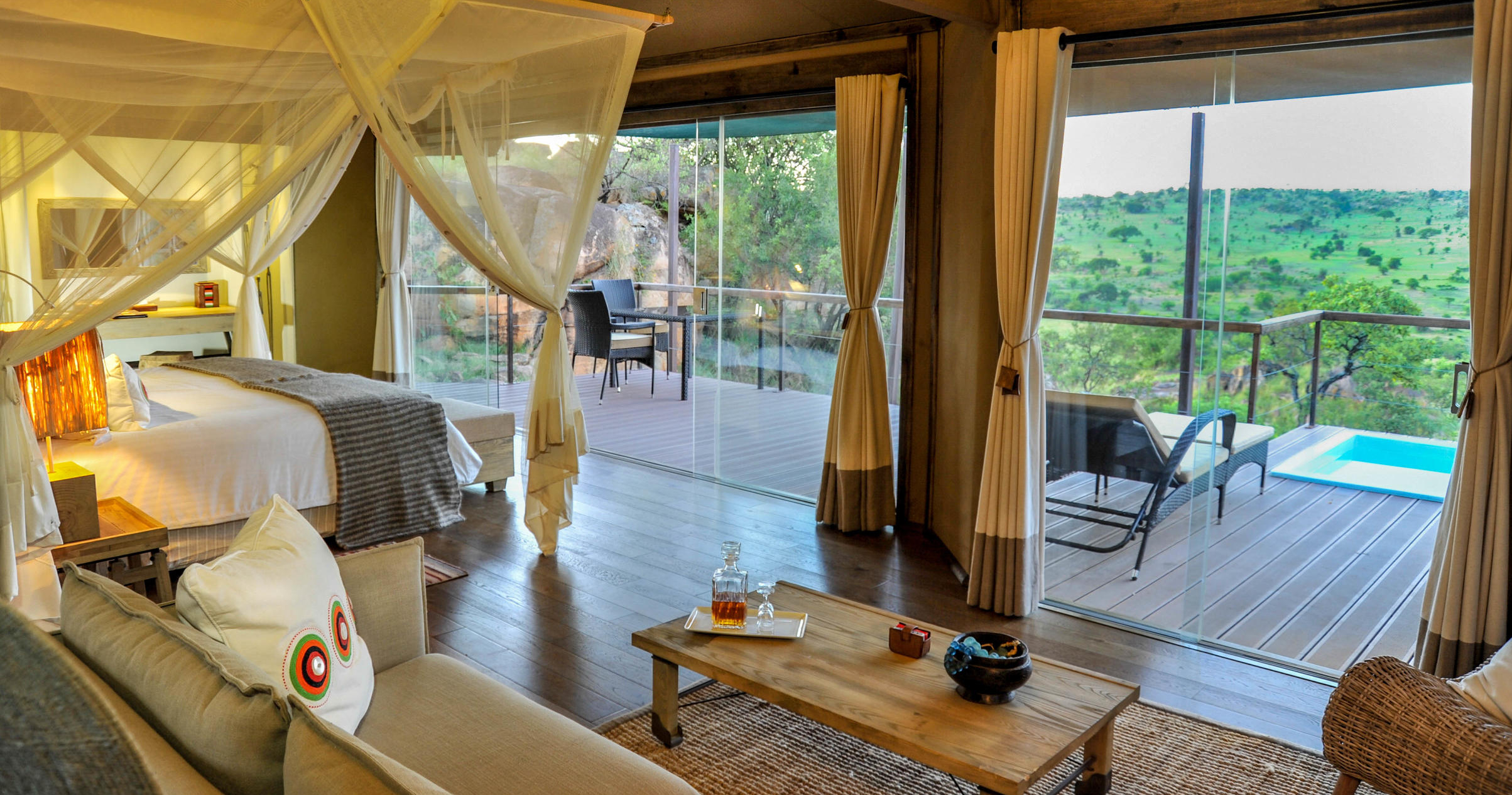 Här kan du njuta av äventyrliga aktiviteter som luftballongturer, stjärnskådning och safaris där du får chansen att komma nära både "Big Five" och den imponerande migrationen. Detta är ett exklusivt boendealternativ för dig som vill ha något utöver det vanliga.