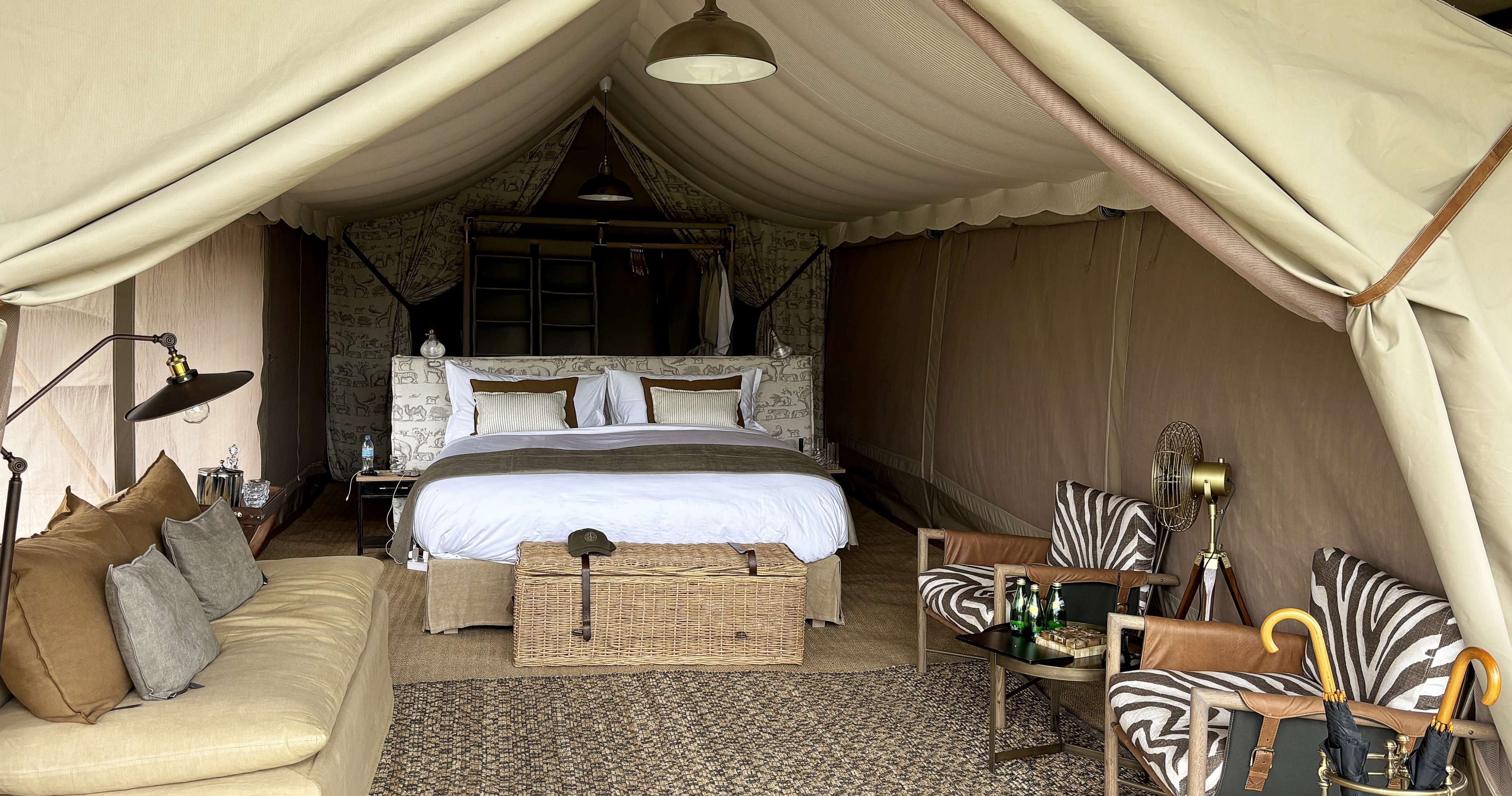 Campen består av smakfullt inredda tält som skapar en härlig safarikänsla. De rymliga tälten har sköna sängar, toalett, dusch och en stor veranda med utsikt över savannen.