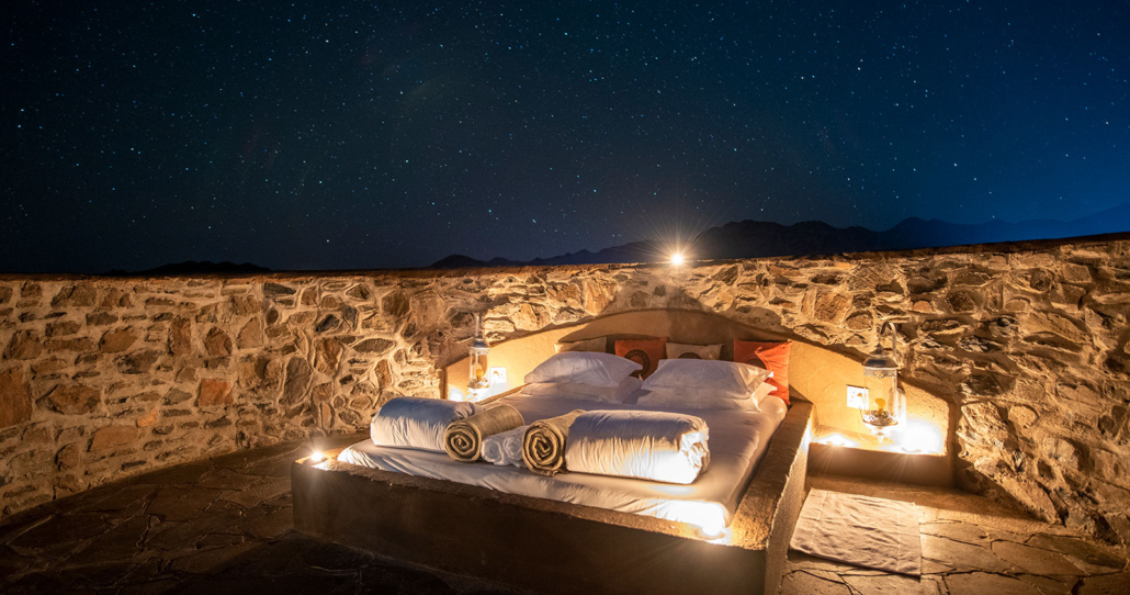 Kwessi Dunes, beläget i NamibRand Nature Reserve, erbjuder en unik ökenupplevelse. Här finns 12 luftkonditionerade stugor, var och en med ett separat "stargazer"-rum öppet mot himlen. Perfekt för att beskåda den afrikanska natthimlen.