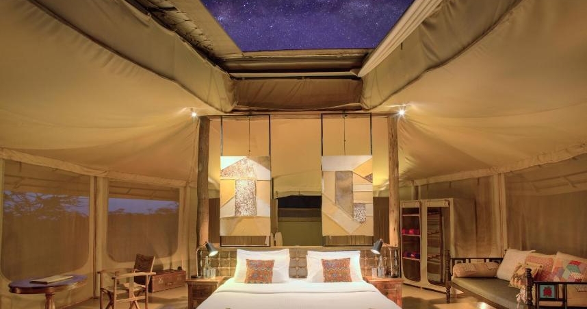 När du ligger i sängen kan du trycka på en knapp för att öppna taket på tältet. Det enda som då skiljer dig från den stora afrikanska stjärnhimlen är ett osynligt myggnät. Här erbjuds en lyxig och naturnära upplevelse av högsta kvalitet.