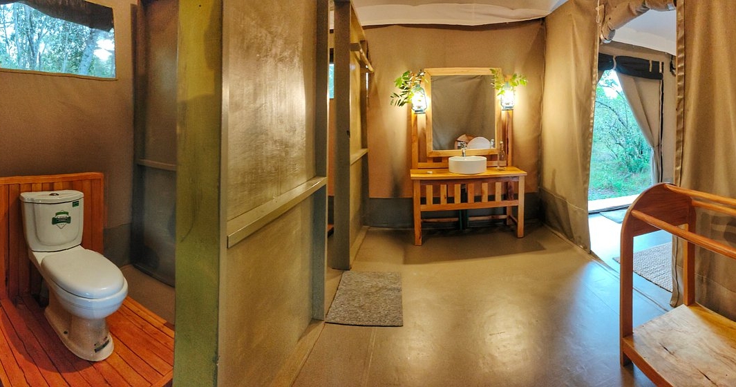 Här finns endast 10 rymliga och komfortabelt inredda tält vilket bidrar till den intima och lyxiga känslan. Varje tält är smakfullt dekorerat med afrikanskt tema. I campens restaurangtält serveras både internationella rätter och lokala delikatesser, tillagade av en erfaren kock.
