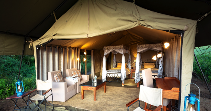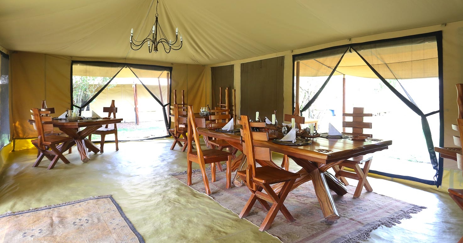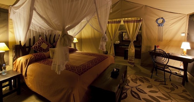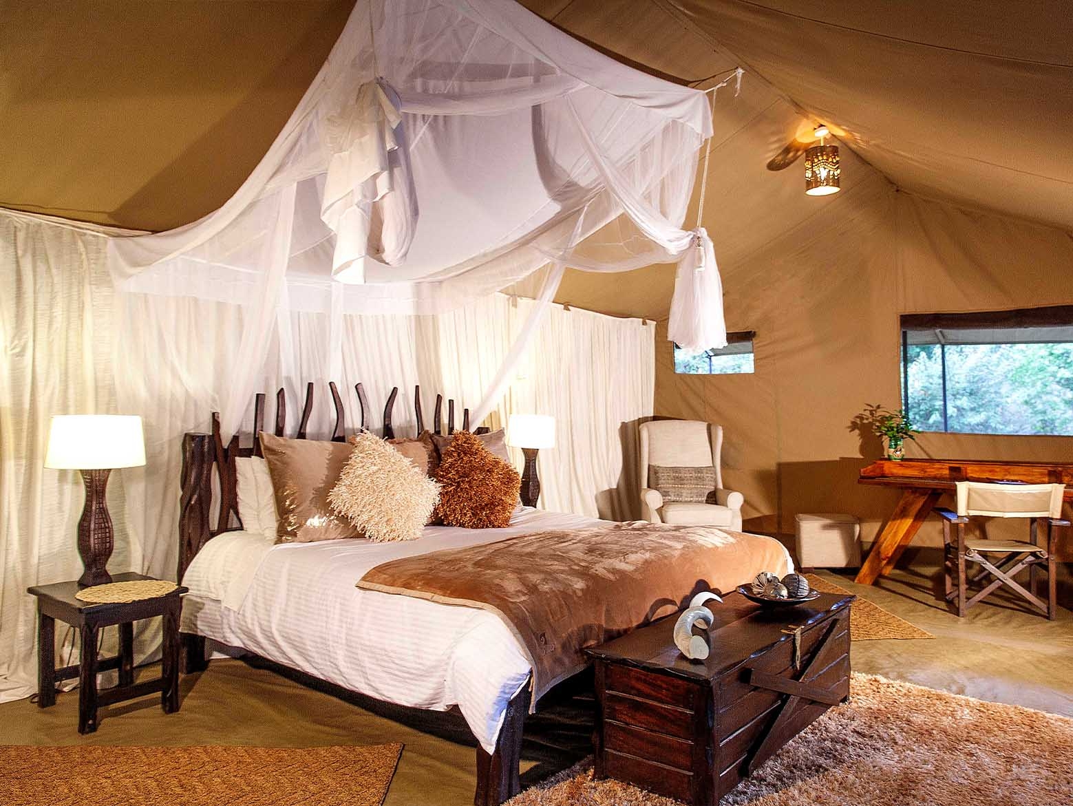 Här finns endast 10 rymliga och komfortabelt inredda tält vilket bidrar till den intima och lyxiga känslan. Varje tält är smakfullt dekorerat med afrikanskt tema. I campens restaurangtält serveras både internationella rätter och lokala delikatesser, tillagade av en erfaren kock.