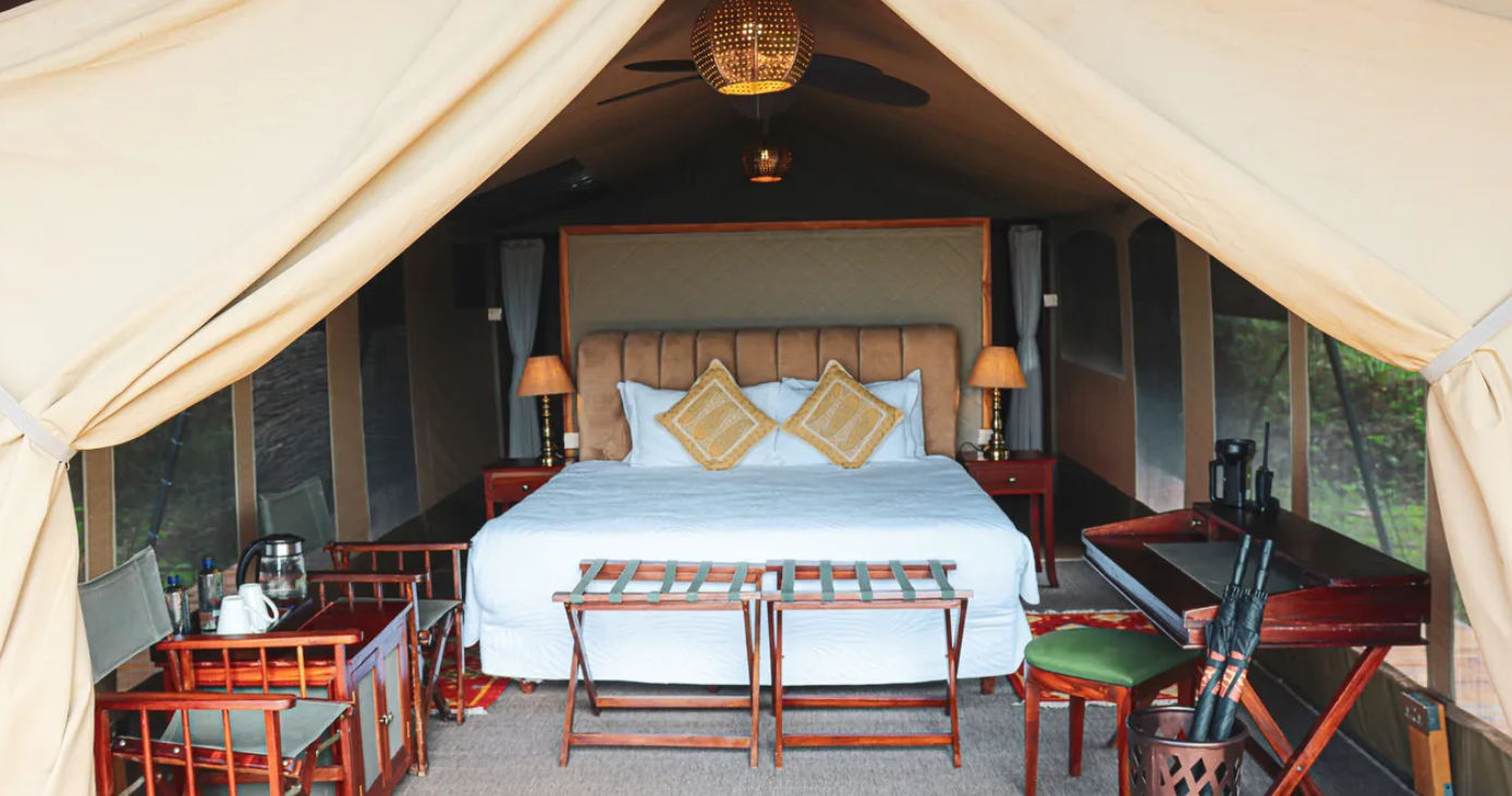 Här finns endast 10 rymliga och komfortabelt inredda tält vilket bidrar till den intima och lyxiga känslan. Varje tält är smakfullt dekorerat med afrikanskt tema. I campens restaurangtält serveras både internationella rätter och lokala delikatesser, tillagade av en erfaren kock.