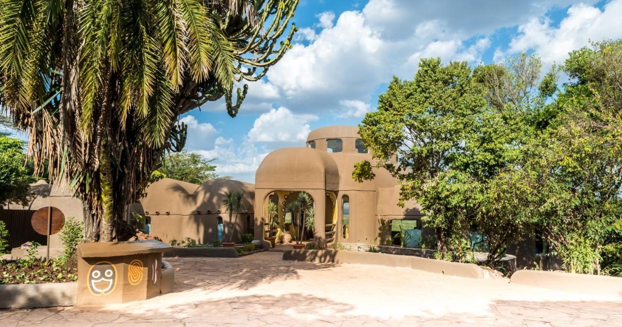 Alla byggnader följer designen av traditionella afrikanska runda hus med koniska tak, och dessa sträcker sig längs kullarna med de imponerande stora offentliga byggnaderna och poolen i centrum.