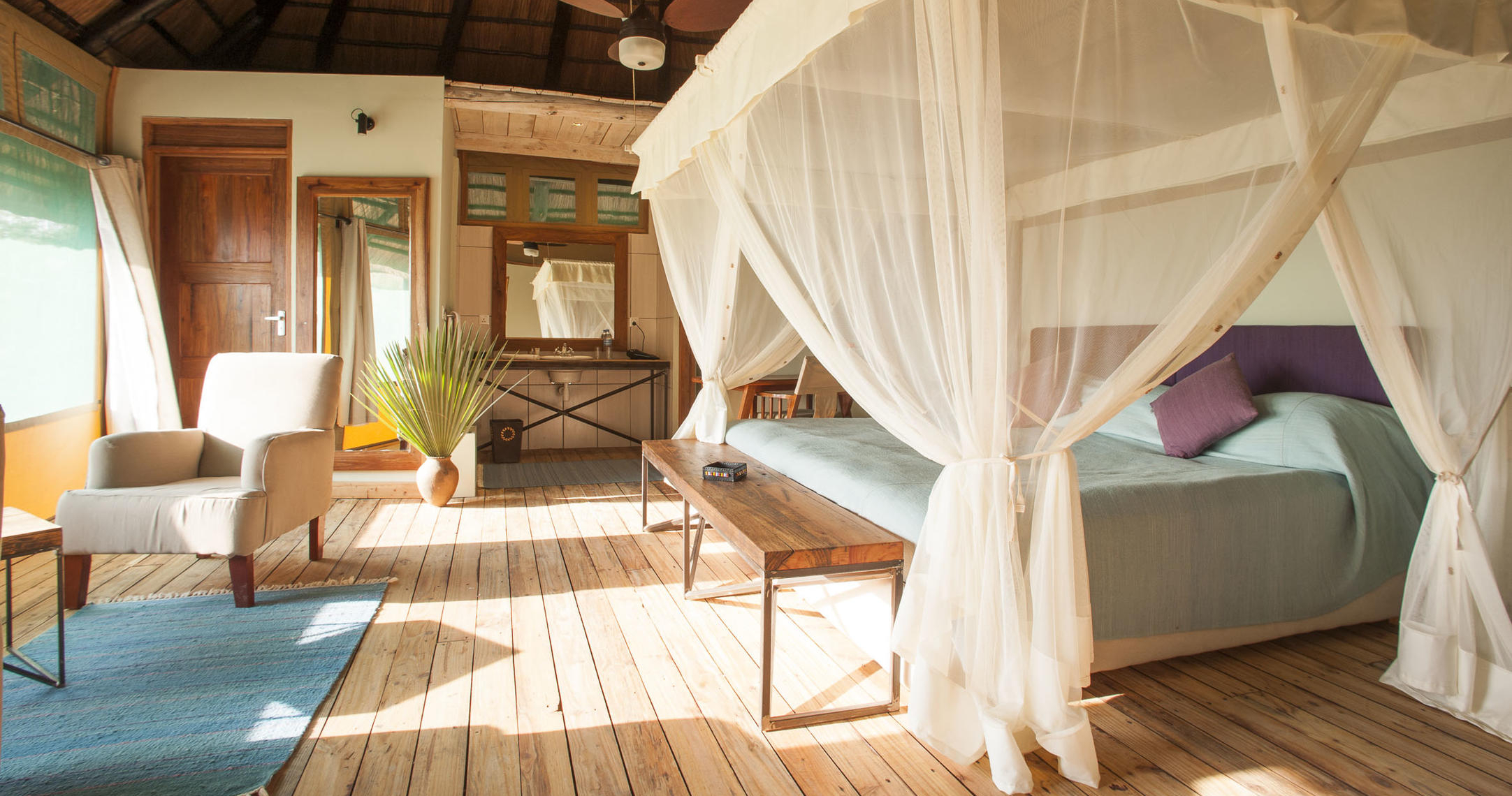 Alla tält har en uteplats, sovrumsdel, och eget badrum med dusch och toalett. Här kan du njuta av naturens lugn och närheten till parkens rika djurliv.