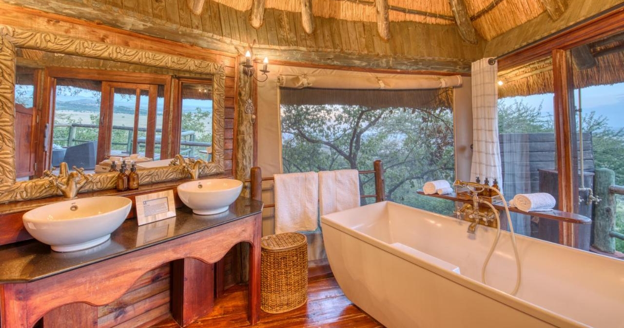 De rymliga tälten står på upphöjda träplattformar och har privat veranda med utsikt över savannen. Tälten är utrustade med badrum med dubbla handfat, toalett samt både en inomhusdusch och en unik utomhusdusch, där du bokstavligen kan duscha under den afrikanska stjärnhimlen! Här kombineras komfort med äkta naturupplevelse.