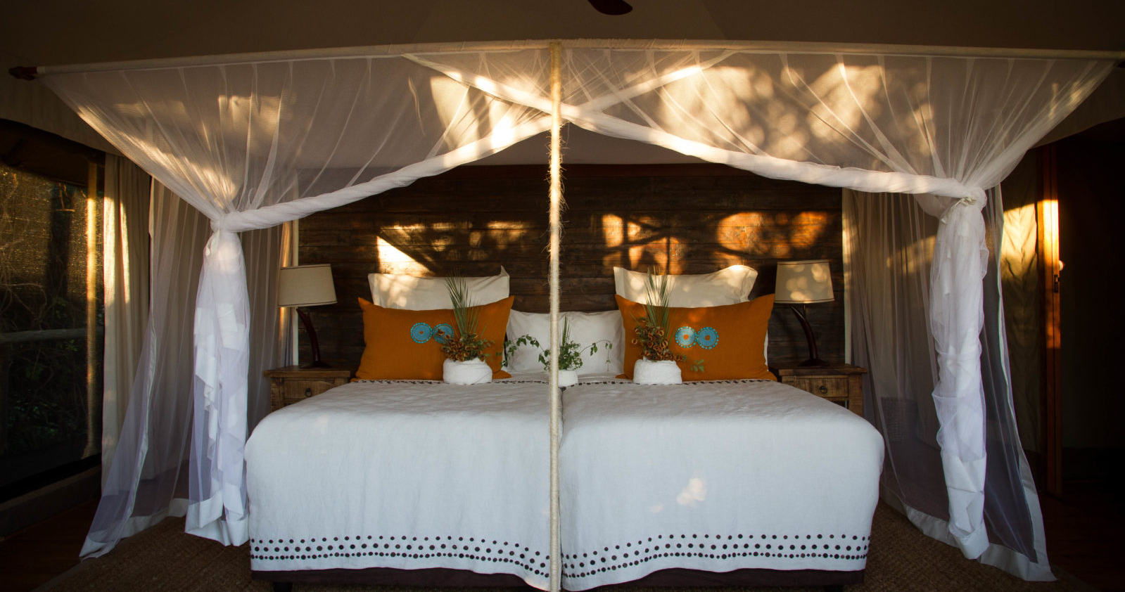 Campen består av tio autentiska safaritält, vilka alla är individuellt utformade och perfekt placerade för att maximera utsikten över omgivningen. Efter en dag i deltat finns det inget bättre än att glida ner i infinitypoolen, omgiven av vildmarkens ljud och vackra vyer.