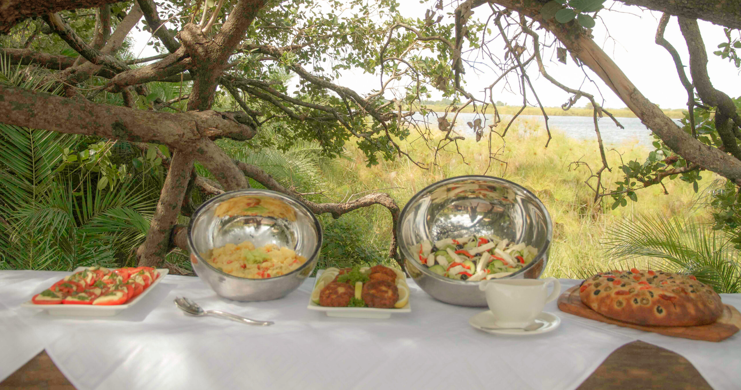 Fly-camps sätts upp speciellt för varje grupp och tas ned efteråt för att säkerställa att inga fotavtryck lämnas på miljön. En privat kock följer med varje campinggrupp för att tillaga färska måltider. Middagen serveras runt en brinnande lägereld under den vidsträckta afrikanska stjärnhimlen.