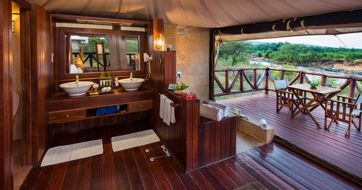 De lyxiga och vackert inredda tälten har egna badrum och är upphöjda på trädäck med utsikt över floden Mara. Njut av närheten till djuren från din privata lounge och veranda, eller under läckra måltider i den öppna matsalen.