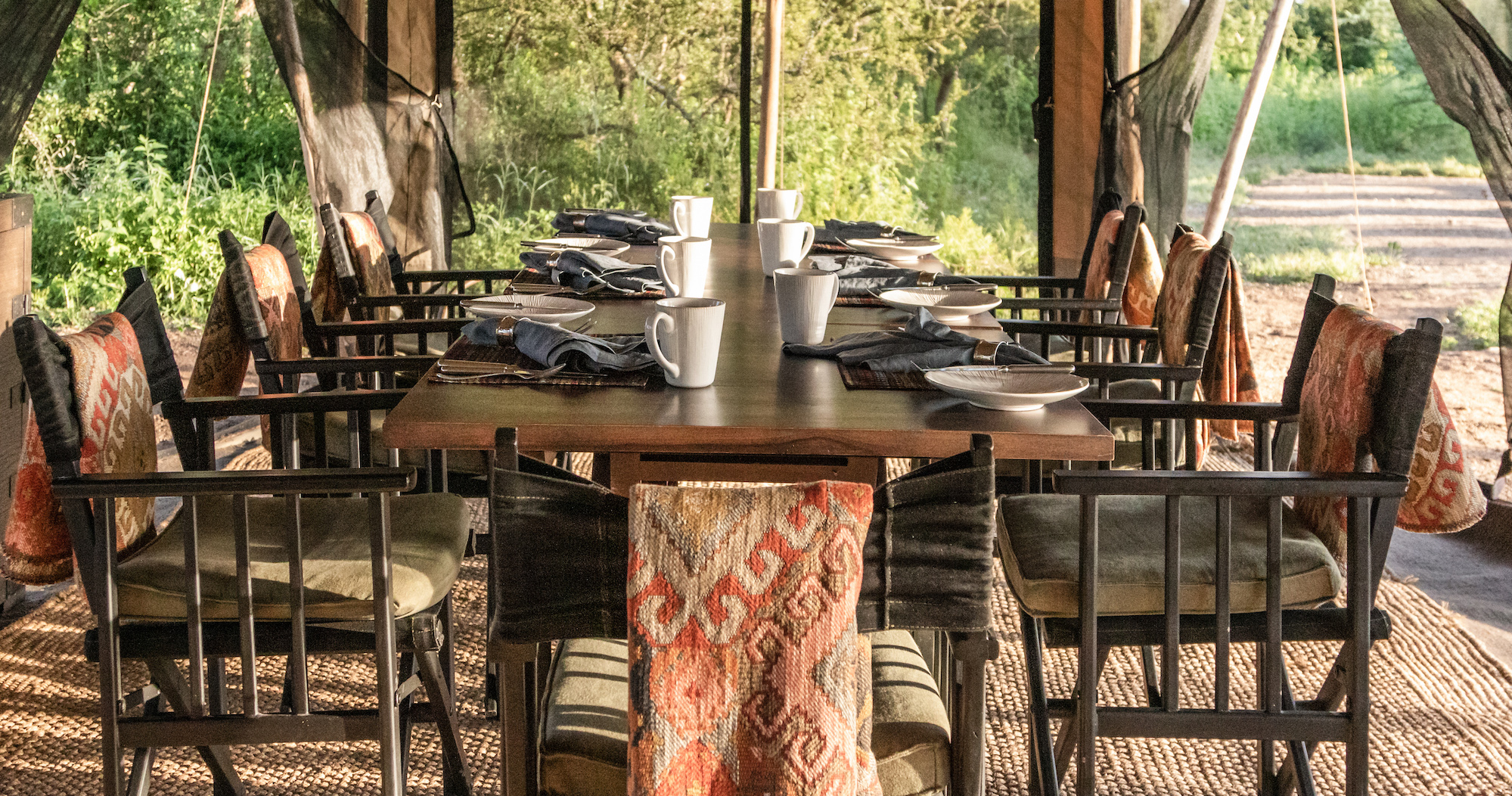Campen består av rymliga canvastält med privata badrum och en enkel men smakfull inredning. Här bor du bekvämt, men med naturen tätt inpå. Måltiderna lagas på plats och serveras ofta utomhus – en lugn paus mellan dagens safariäventyr.