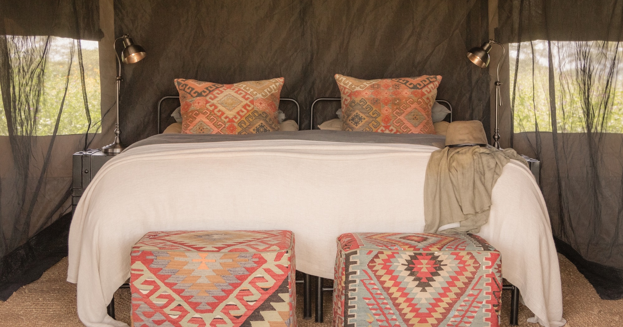Campen består av smakfullt inredda tält som skapar en härlig safarikänsla. De rymliga tälten har sköna sängar, toalett, dusch och en stor veranda med utsikt över savannen.