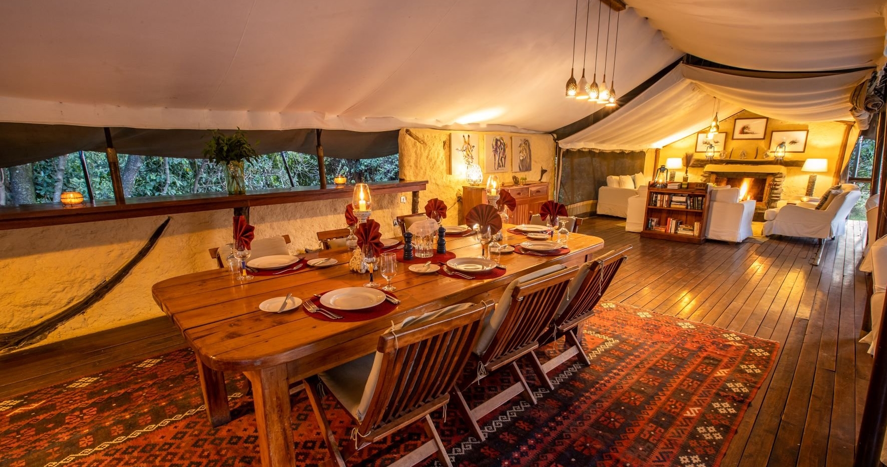 Här finns endast 10 rymliga och komfortabelt inredda tält vilket bidrar till den intima och lyxiga känslan. Varje tält är smakfullt dekorerat med afrikanskt tema. I campens restaurangtält serveras både internationella rätter och lokala delikatesser, tillagade av en erfaren kock.