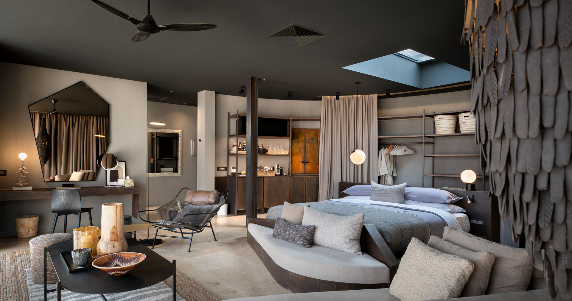 Lodgen erbjuder tolv exklusiva sviter byggda i sten och glas. Varje svit har ett utdragbart takfönster för att titta stjärnorna från sängen, en privat och veranda med och pool. Här kan du njuta av stjärnklar himmel, enastående utsikt och ett överväldigande lugn i ett av Afrikas mest fascinerande landskap.