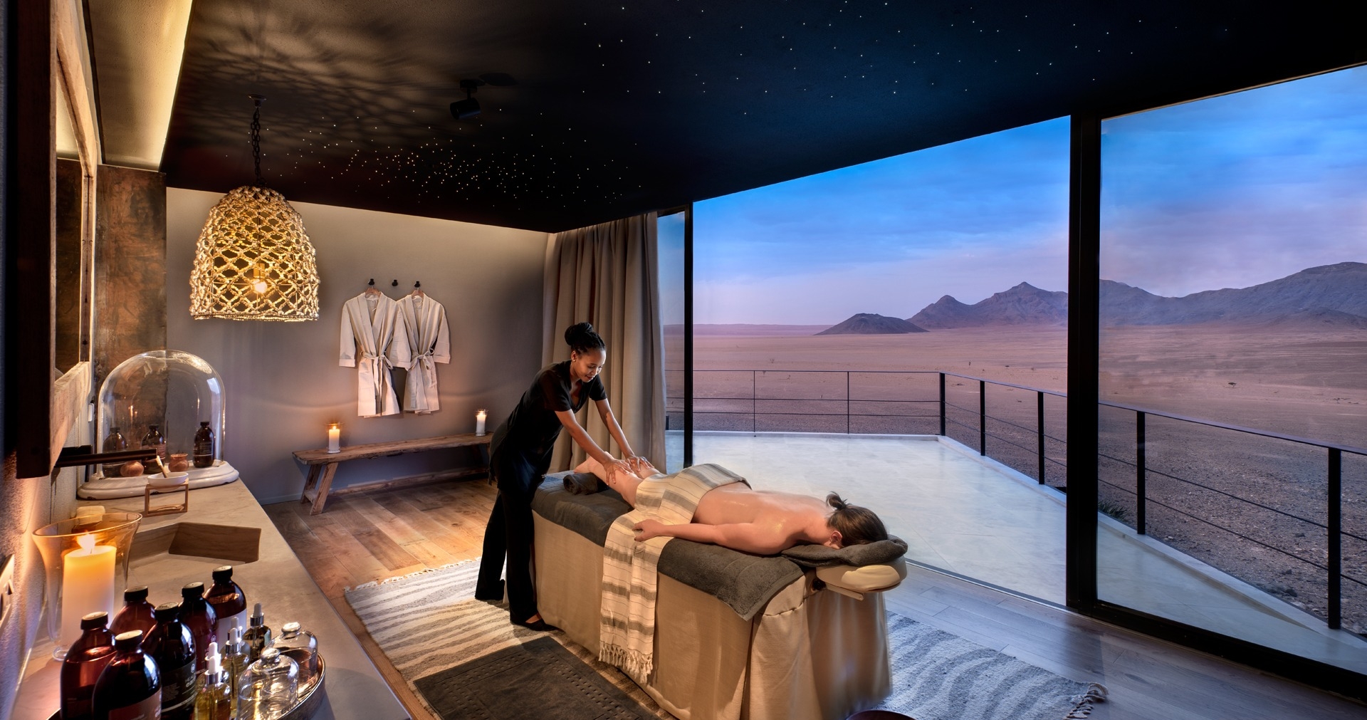 Kwessi Dunes, beläget i NamibRand Nature Reserve, erbjuder en unik ökenupplevelse. Här finns 12 luftkonditionerade stugor, var och en med ett separat "stargazer"-rum öppet mot himlen. Perfekt för att beskåda den afrikanska natthimlen.