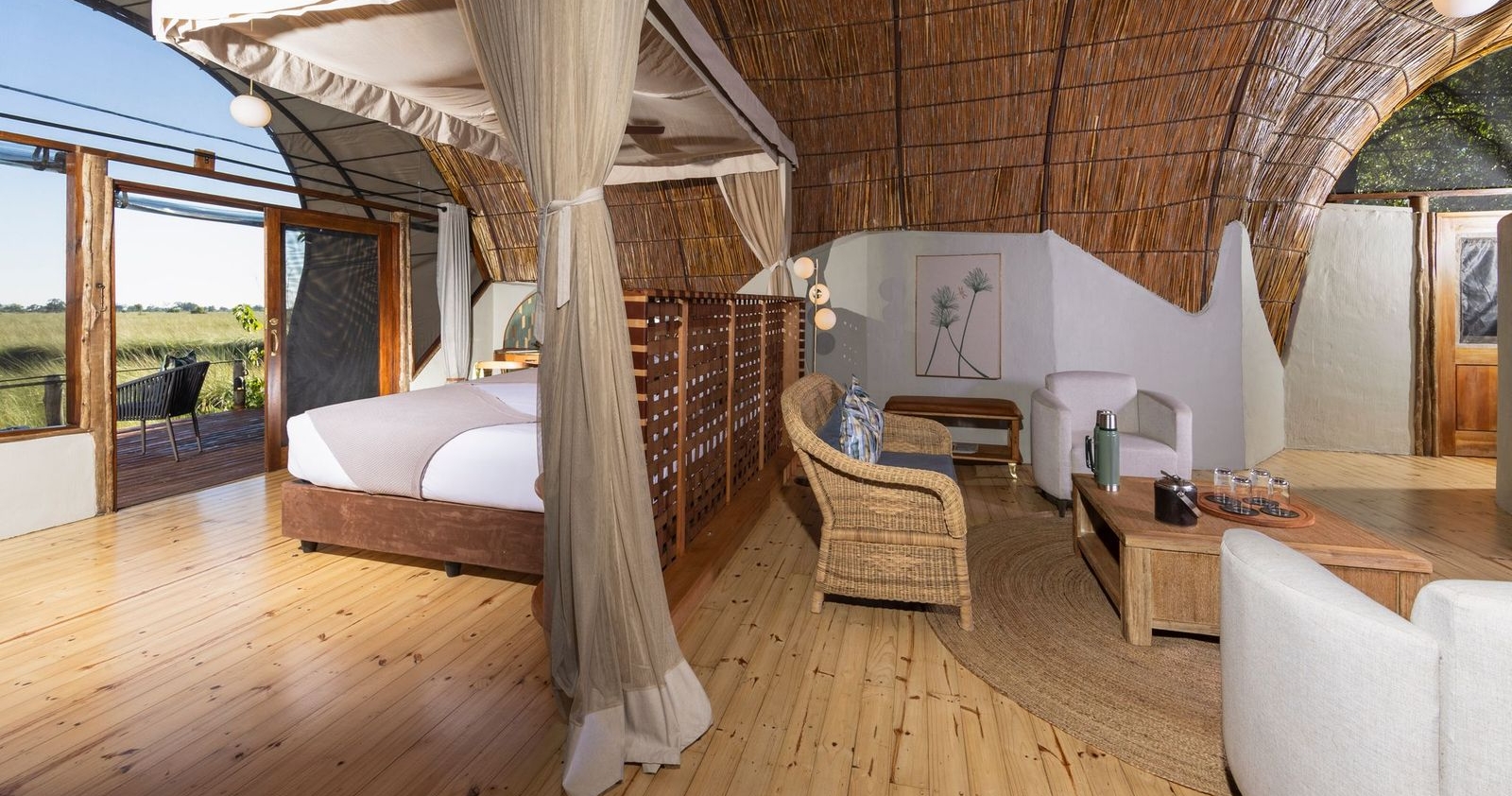 &Beyond Sandibe Okavango Safari Lodge är en exklusiv safarilodge i hjärtat av Okavangodeltat. Lodgen erbjuder 12 lyxiga och luftkonditionerade sviter, som var och en är utformad för att efterlikna vävarfågelbo.
