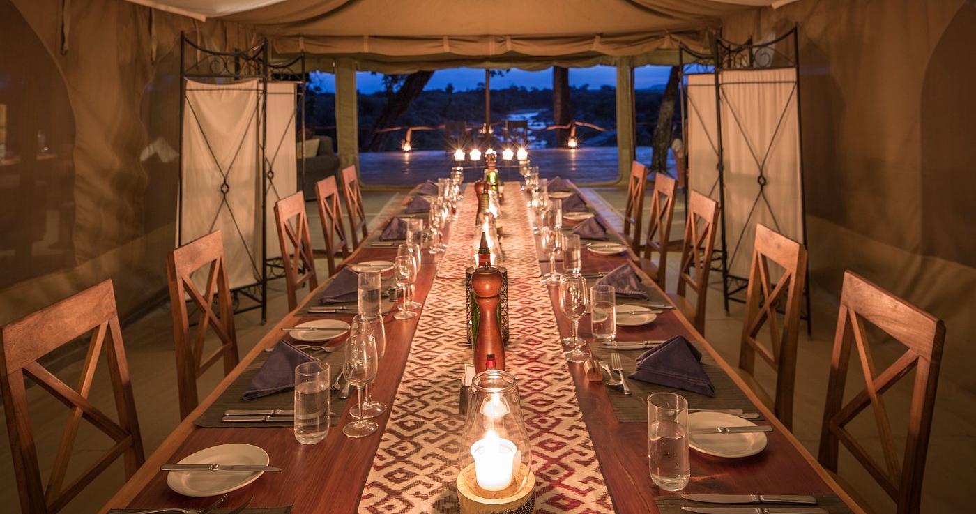 Här finns endast 10 rymliga och komfortabelt inredda tält vilket bidrar till den intima och lyxiga känslan. Varje tält är smakfullt dekorerat med afrikanskt tema. I campens restaurangtält serveras både internationella rätter och lokala delikatesser, tillagade av en erfaren kock.