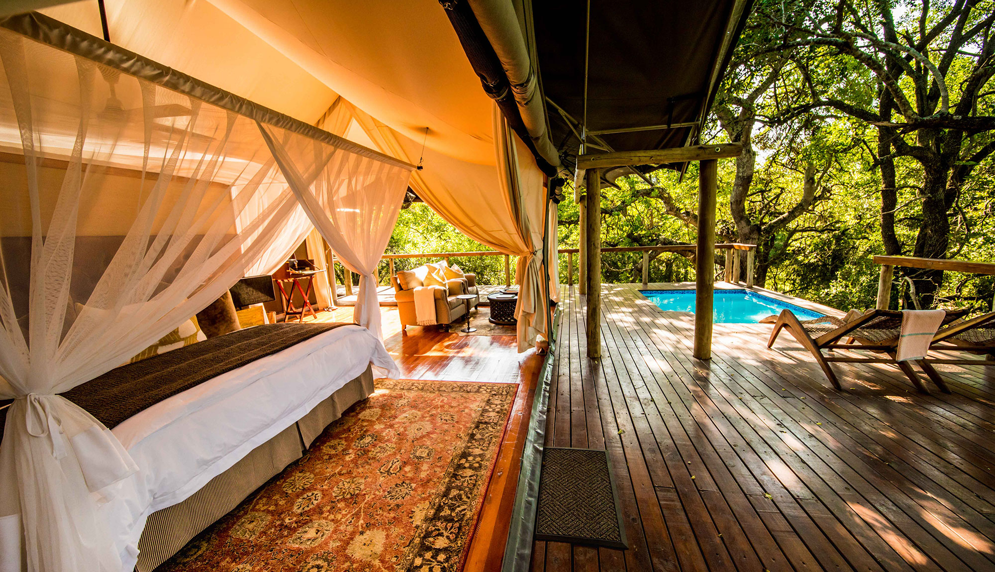Varje tält har en lounge, inomhus- och utomhusdusch, badkar, privat däck med pool och vidsträckt utsikt över Msunduze-floden. Tälten kan öppnas på tre sidor, vilket skapar nära kontakt med naturen. Mitt i campen finns loungedel, bar, boma (eldplats) och ytor för gemenskap och avkoppling.