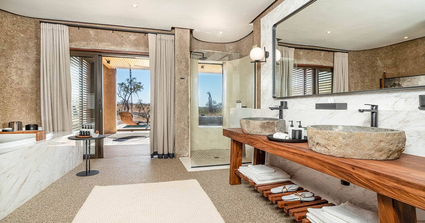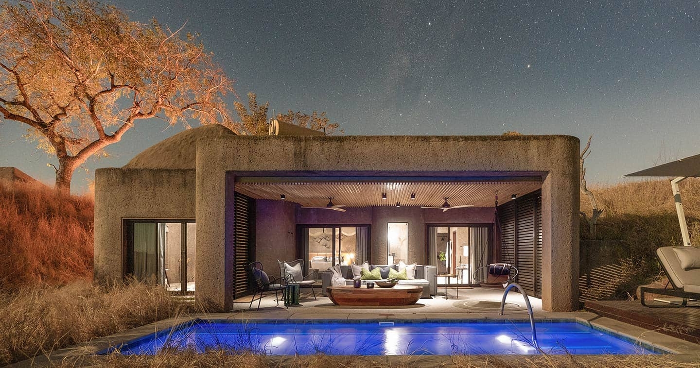 Varje svit har modern afrikansk design, fullt utrustat badrum, privat terrass med uppvärmd spa-bad och utsikt över flodbädden. Mellan safariturerna finns det möjlighet att koppla av vid poolen eller ge sig ut på promenader i omgivningen. Det här är ett perfekt boende för dig som söker en exklusiv och avskild safariupplevelse.