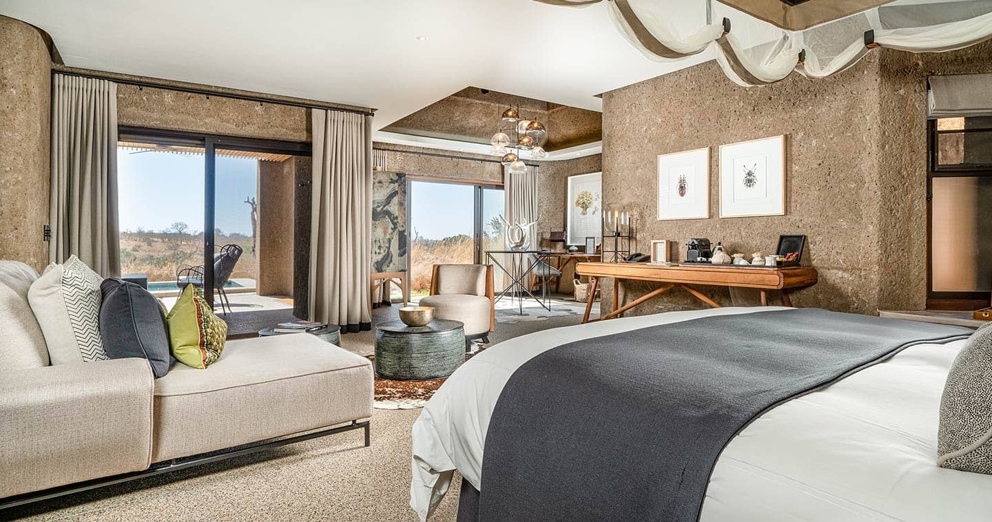 Lodgen består av 13 sviter och en privat villa, alla utformade med modern arkitektur som smälter samman med omgivningen. Sviterna är rymliga med glasväggar som maximerar utsikten. För dig som vill uppleva den afrikanska stjärnhimlen på ett extra speciellt sätt finns trädäck med utomhussängar.