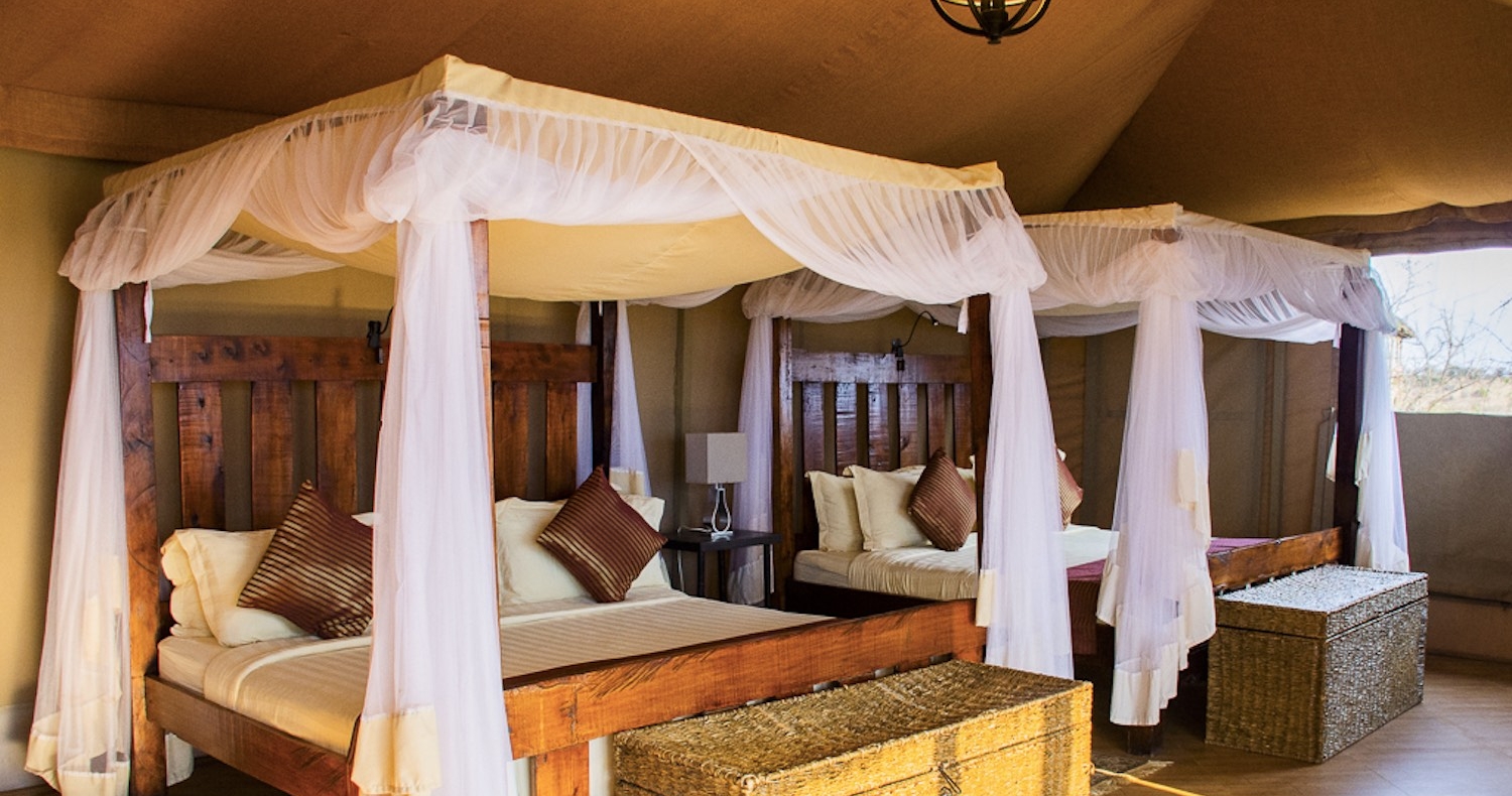 Campen består av smakfullt inredda tält som skapar en härlig safarikänsla. De rymliga tälten har sköna sängar, toalett, dusch och en stor veranda med utsikt över savannen.