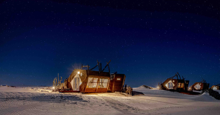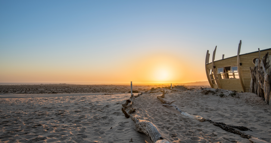 Shipwreck Lodge, beläget i Skeleton Coast National Park, är känd för sin unika arkitektur som påminner om skeppsvrak. Det här är ett exklusivt och äventyrligt boende med 10 lyxiga stugor, inklusive familjestugor, som alla har panoramautsikt över Atlanten.