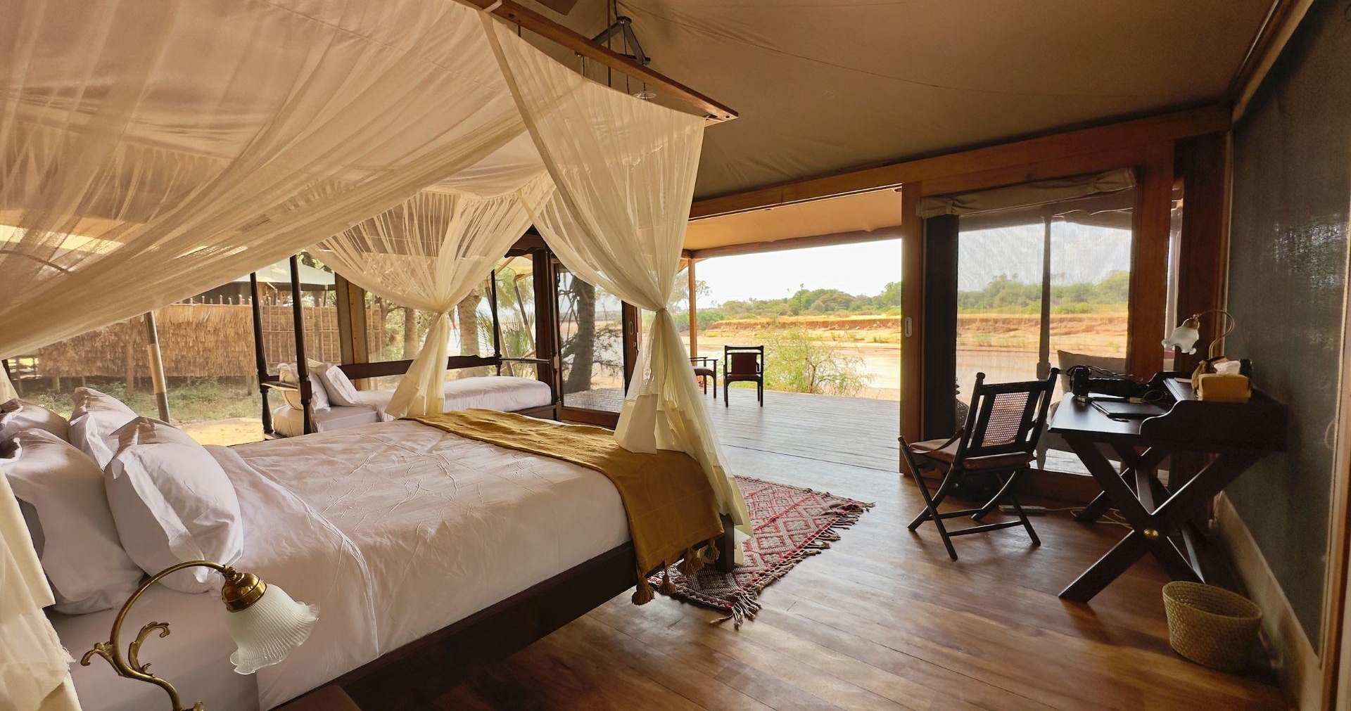 Tälten är moderna och har både toalett och dusch. Från terrassen svalkas du av ljummen flodbris och njuter av Samburus vackra natur.