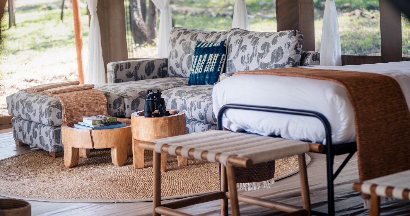 Campen består av smakfullt inredda tält som skapar en härlig safarikänsla. De rymliga tälten har sköna sängar, toalett, dusch och en stor veranda med utsikt över savannen.