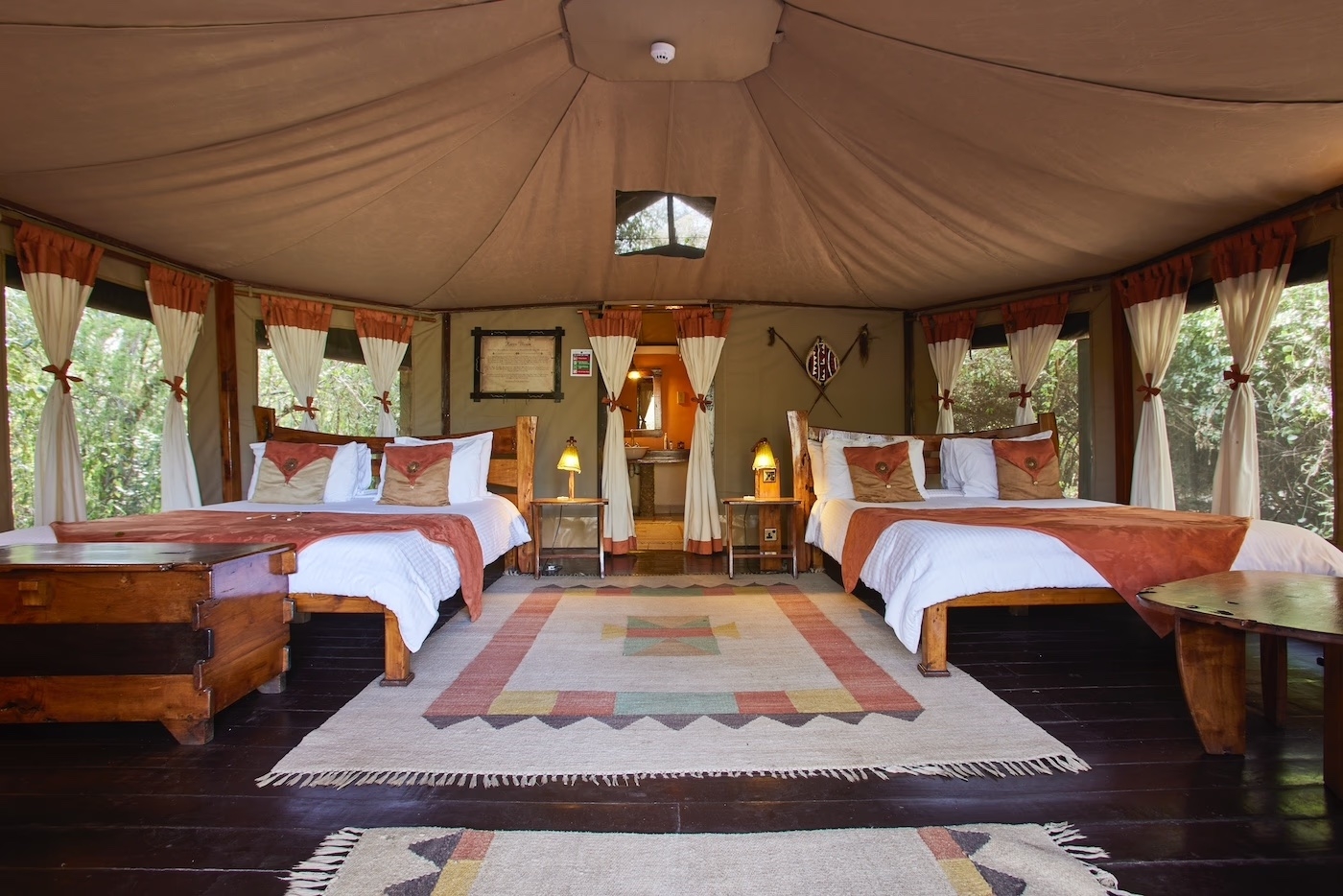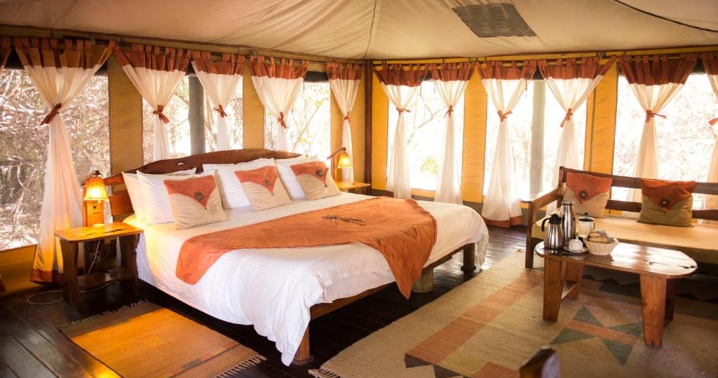 Här finns endast 10 rymliga och komfortabelt inredda tält vilket bidrar till den intima och lyxiga känslan. Varje tält är smakfullt dekorerat med afrikanskt tema. I campens restaurangtält serveras både internationella rätter och lokala delikatesser, tillagade av en erfaren kock.