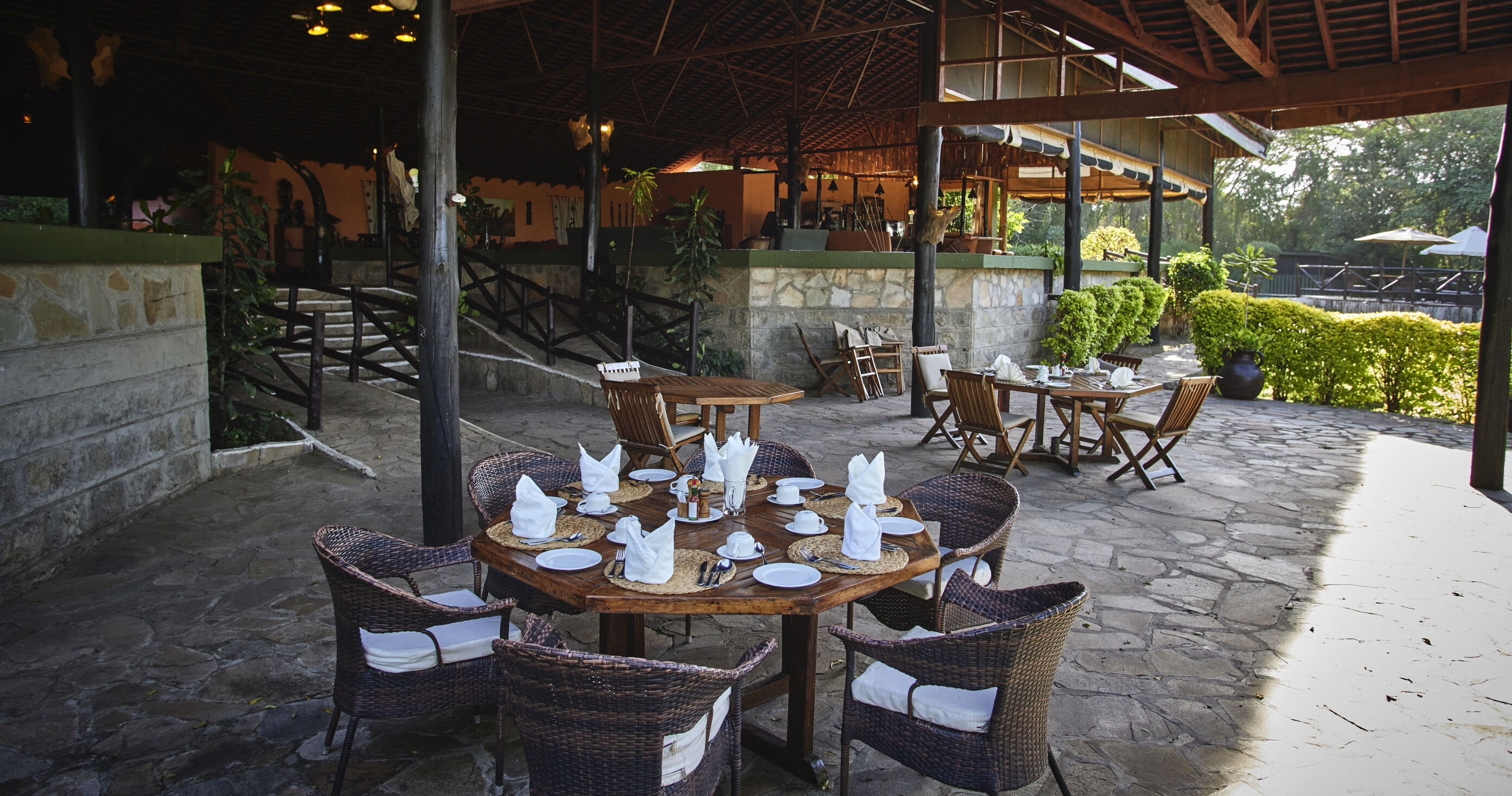 På campens gård odlas frukt och grönsaker som serveras i den öppna restaurangen. Här erbjuds utsökta måltider och en fantastisk utsikt över både soluppgången och solnedgången.