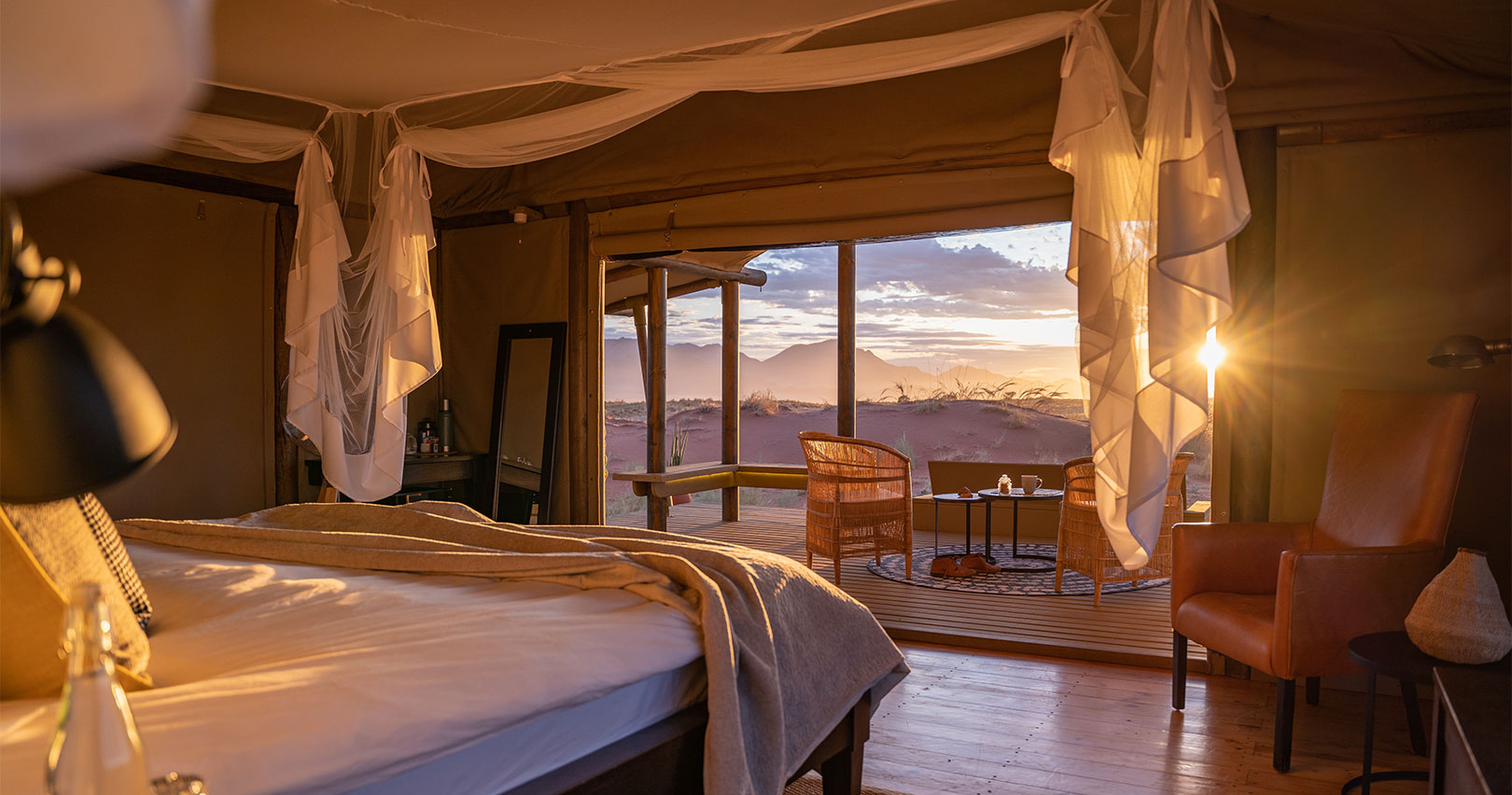 De tio tältade rummen är byggda för att maximera utsikten över det orörda sandlandskapet och varje rum har en privat veranda. Här kan du sova med öppna canvas-blinds för att njuta av den svala kvällsbrisen och den stjärnklara himlen.